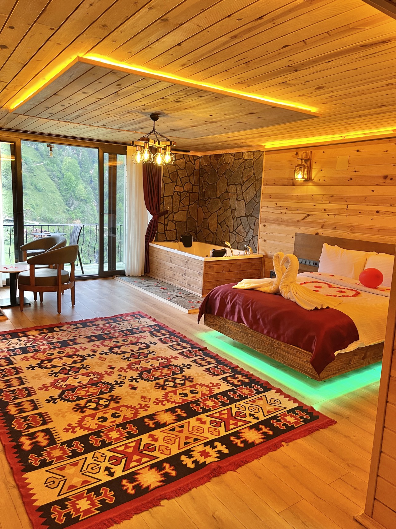 Odamız 40 metrekare olup vadi, dere, dağ manzaralıdır. Bir çift kişilik yatak mevcuttur.